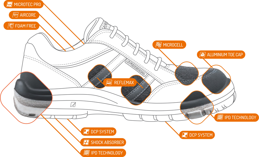La plantilla ergonómica acolchada junto con el sistema IPD Technology de amortiguación progresiva absorbe la energía del impacto en el talón, disminuyendo la fatiga y brindando mayor confort durante todo el día.